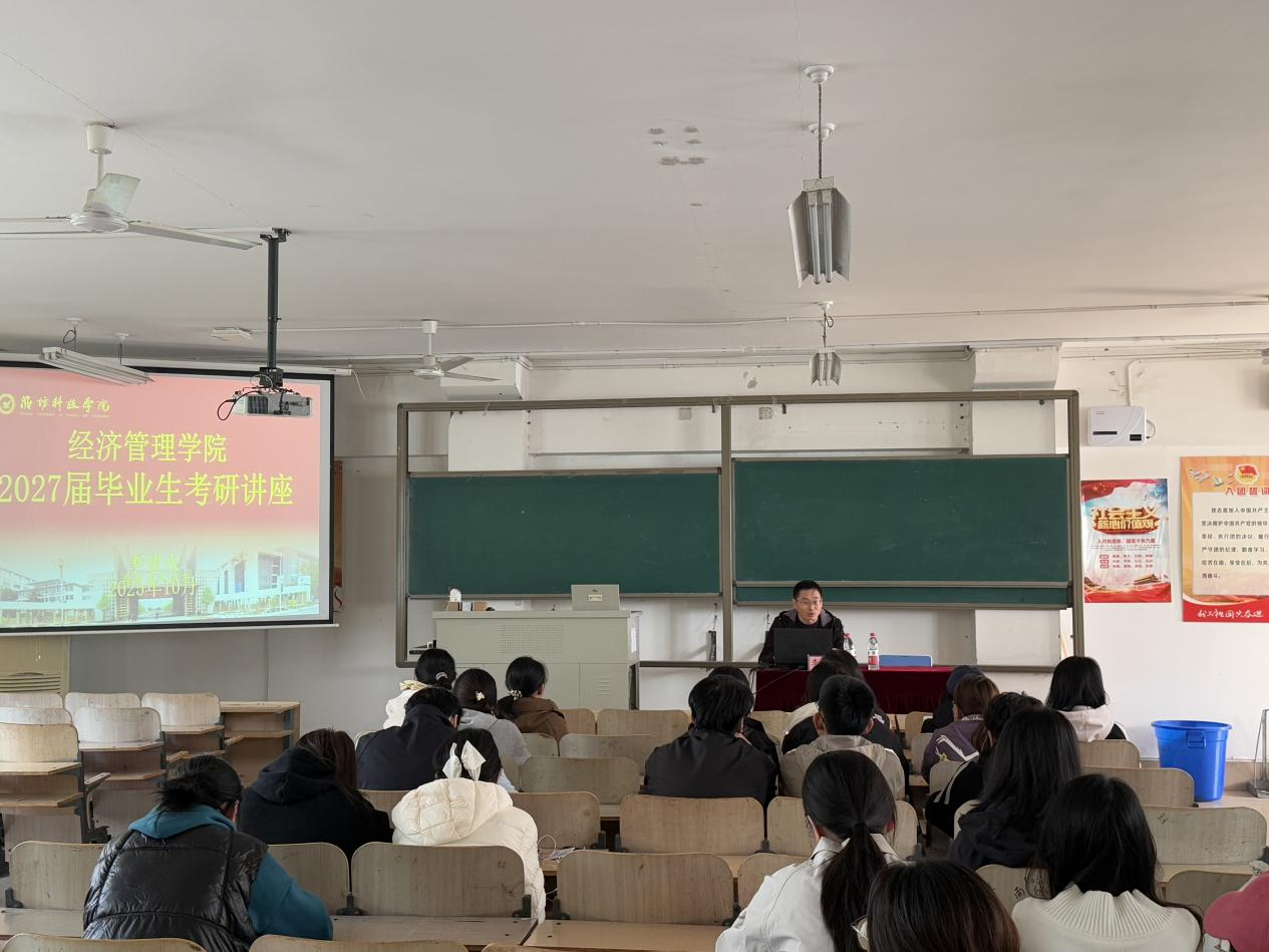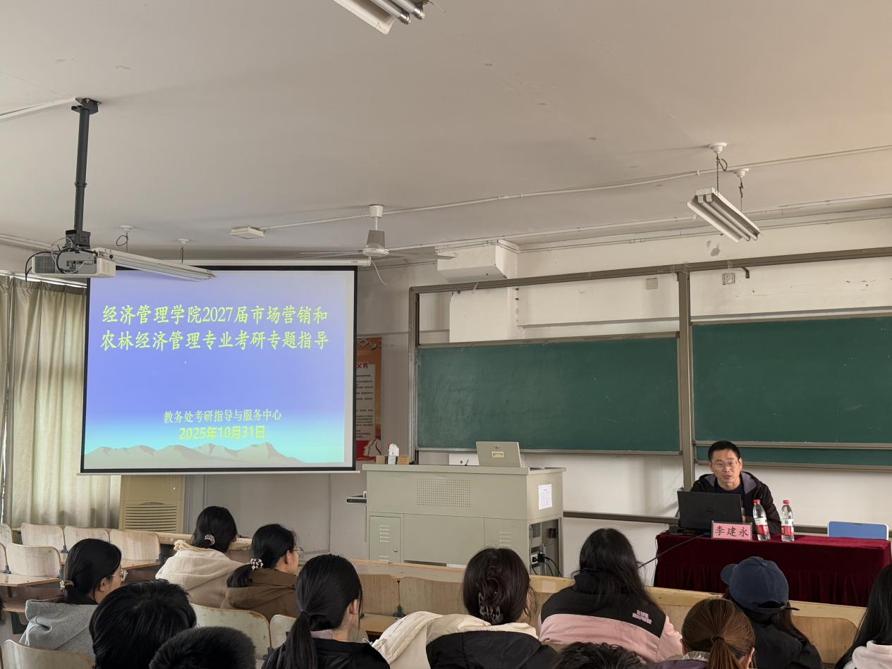为帮助同学们精准把握考研趋势,掌握科学备考方法,提升备考效率,suncitygroup太阳集团在421教室举行“2027届毕业生考研”专题讲座。讲座特邀学校考研中心李建永主任主讲,2023级农林经济管理与市场营销本科专业计划考研的学生参加了本次活动。